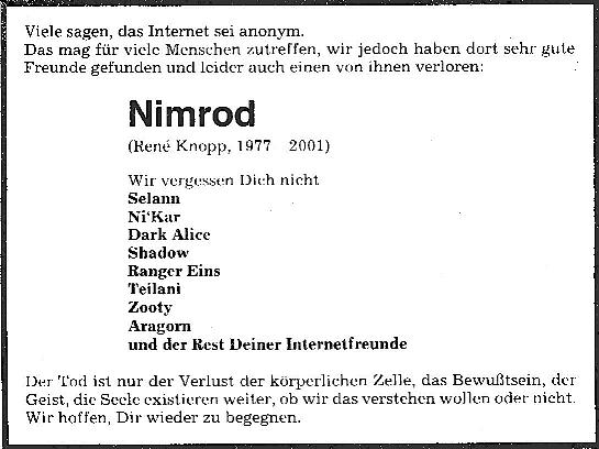 Hier ist meine Gedenkseite für meinen Kumpel Nimi, der den Begriff "Romulingonin" erfand und der durch seinen trockenen Humor und seine witzigen Einfälle unser Forum in der Babylon 5 Alliance bei Berny massgeblich geprägt hat.